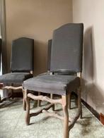Deze stoelen zijn goed gebruikt want ze zitten goed. De stof is aan vervanging toe. De poten zijn mooie afgeschuurd hout.