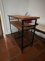 Bijzettafel in licht metaal met houten blad, wieltjes en manden.