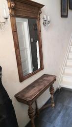 Mooie originele mechelse side-tafel en spiegel. In goede staat! Mooi opgeschuurd, klaar om te schilderen of te boenen. Afmetingen: spiegel h117cm, b69/79cm side-tafel h73cm, b90cm af te halen puurs (w