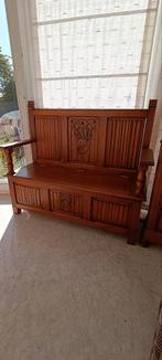 Eikenhouten bank. Hoogte 110 cm breedte 126 cm diepte 49 cm zithoogte 45 cm heeft altijd in inkomhal gestaan maar nu in overtal.