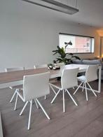 - 6 witte lederen stoelen - moderne stijl - gekruiste witte poten - prima zitcomfort - hoogte: 81,5cm - breedte: 44cm - diepte: 52cm - zithoogte: 46cm - wij verkopen ze door aankoop meubels in andere