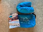 Blauwe zitzak gemaakt van sterk polyester staat binnen 60 seconden vulbaar met lucht, geen pomp nodig handig draagtassen weegt 750 gram nooit gebruikt