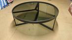 Mooie ronde degelijke slaontafel. 90 Cm doorsnede 35cm hoog. Degelijke metalen onderstel met veiligheidsglas blad, donkerglas