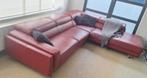 Grote lederen sofa in l-vorm met opklapbare rugleuningen. Leder toont gebruik, maar geen schade. Afmetingen te zien op laatste sli