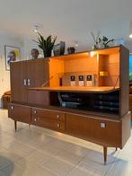 Mooie vintage barkast, met verlichting in het bargedeelte. Kast is in 2 delen zodat ze makkelijk te vervoeren is. Hoewel de kast over het algemeen in goede staat is zijn er enkele kleine mankementjes,