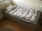 Lit en placage de frêne, avec boîte à tiroirs. À L'état neuf, dimensions 90 x 200 cm, matelas inclus éventuellement