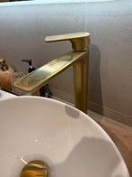 Gouden wastafelkraan in goede staat. 1 Jaar gebruikt. Heeft gebruikssporen aan de bovenkant – zie foto’s. Werkt perfect, enkel cosmetische slijtage. Kan weggewerkt worden