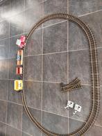 12 bochten 32 cm 1 wissel 8 rechte stukken 17cm locomotief rood 26cm aanhanger bruin 30 en 14 cm aanhanger geel 30cm (haakje dient vervangen te worden) paaltjes grijs 25 cm