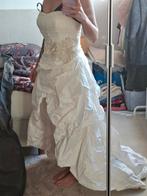 Prachtig trouwkleed, tweedelig. Sleep kan je af doen. Kleedje in kant met steentjes en pareltjes. Aangehad in jaar 2012, nieuwkuis gehad. Maat 40, 42.