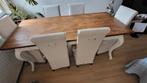 Tafel en stoelen van riviera maison. Afmetingen staat op de foto. Alles zijn in goed staat alleen 2 hoezen van stoelen is genaaid