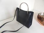 Blauw lederen handtas met metalen handvaten en lange schouderriem - 1 binnenzakje met rits - magnetische sluitknoppen -