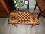 Houten schaaktafeltje met 2 taferelen van tin-tin (kuifje) met fineer-inlegwerk + houten schaakstukken. Uniek stuk, collecters-ite