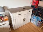 Houten kast met 2 schuiven en 2 deurtjes. Afmetingen kast hoogte 88cm, diepte 45cm, breedte 110cm aangekocht bij weba. Voor meer v