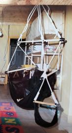 Hangzetel van echt zwart leder, hout en touw. Met voetensteun. Heel stevige constructie. Een uniek stuk en blikvanger in uw woonka