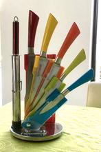 De messenset bestaat uit 5 messen ( incl hakmes) en een slijpstaaf, dit alles op een draaibare standaard. Levendige kleurtjes. Van het met swiss line switserland. De handvaten hebben gebruiksporen, zi