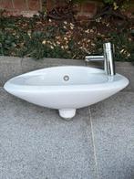Compacte wastafel in goede staat, ideaal voor toilet of kleine badkamer. Inclusief kraan met drukknop (chroom). De wastafel is netjes onderhouden, enkel licht gebruikte staat zoals op de foto. Materia