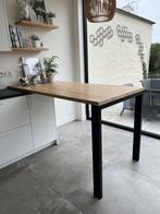 Houten tafelblad met -verwijderbare- zwarte metalen poot aan 1 kant (leunt aan andere kant op het keukenblad). Vermoedelijk beuk.