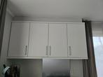 Volledige keuken met bijkeuken. Gasveer en tafel met 4 stoelen zitten er ook bij. Is een gewone simpele gebruikte witte keuken die