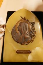 Cet objet présente une gravure en relief sur du métal fin, incorporée dans un élégant cadre métallique avec un bord et un support dorés. Le relief représente la célèbre apparition de notre-dame de lou