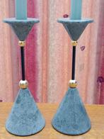 Twee unieke kandelaars van de franse ontwerper christian de beaumont, model memphis materiaal: groene marmer met messing bolletje