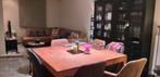 Vierkante eikenhouten eettafel met 8 bijhorende houten stoelen. Poten kunnen van het tafelblad afgehaald worden. (Reeds gedemonteerd). Er is een vlekje op de tafel (zie foto), maar dit kan behandeld