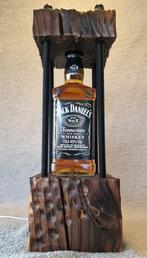 Een originele jack daniel’s fles, geklemd tussen twee verbrande houten blokken, vastgezet met zwarte schroeven. Een uniek, rustiek-industrieel accessoire — perfect voor mancaves, thuisbars of stijlvol