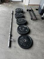 107,5kg rubberen olympische grip gewichten + halterstang 220cm ,20kg gewichten : 2x20kg ,2x15kg, 2x10kg ,2x5kg ,2x2,5kg ,2x1,25kg de complete set is nog in prima staat. De gewichten set staat over de