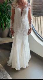 Mooie 2 de hands trouwjurk , ik ben 1.69M groot en weegde 58 kg , ik draag een hakje van 3 cm onder de jurk , vestje is apart te kopen . De jurk is professioneel gereinigd zie foto . Prijs is bespreek