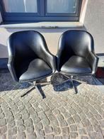 Twee zwart lederen draaibare kuipstoelen (€ 40 per stoel) kuipstoelen op één poot met stervormige voet (wijdte 56 cm) breedte