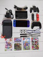 Nintendo switch met pro controller, 2 joy controllers, dock, oplader, hdmi kabel en opbergtasje. De vier games zijn minecraft, splatoon 2 en just dance 2019. Mario en sonic op de olympische spelen is