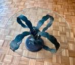 Salontafel, metalen onderstel en glazen blad in goede staat. Diameter = 1,10 m. Hoogte = 0,75 m.