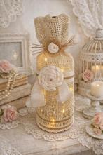 Bouteille lumineuse chabby chic réalisation artisanale verre, coton, dentelle, jute, tulle, guirlande lumineuse led