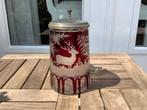 Choppe ancienne avec scène de chasse gravée. Joli bouton en verre de couleur rouge pour ouvrir le couvercle. Le couvercle en verre est serti dans de l