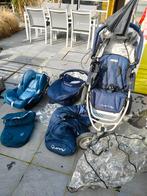 Buggy met 3 wielen. Draagmand en maxi-cosi kunnen op de buggy geplaatst worden. 2 Bijpassende slaapzakjes en 3 regenhoezen. Maxi-cosi bevat nog een verkleinkussentje. De buggy is veel gebruikt, remmen