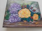 Petite peinture "lilas et roses" à l'huile et acrylique elle a eté exposée plusieurs fois et a eu du succès prix 260€ masques peints 8€ pièce/2 pces technique du marbling