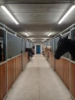 Boxe de 3m90 x 3m50 équipée de paille, d'un système d'eau automatique, du préfané et/ou du foin cultivé par nous mêmes, piste extérieur, prair