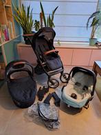 Musty evo donkerblauw. Complete set in gebruikte, maar goede staat: - maxi cosi (merk maxi cosi) met adapters, zonehoes, verkleinkussens, matrasje met luchtige gaatjes, blauwe hoes en extra groene hoe