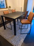 Dimensions : tableau : largeur 90 cm - longueur 150 cm - hauteur 88 cm sièges : 4 chaises en cuir marron cognac avec pieds noirs