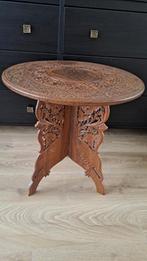 Table en bois unique faite à la main avec un motif floral magnifiquement détaillé. Le dessus et les pieds sont richement décorés d