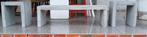 Duurzaam massief betonnen bankje/salontafel in het wit voor zowel binnen als buiten gebruik, meerdere stuks beschikbaar. Ook beschikbaar in het grijs. 150€ voor 2 stuks afmetingen in cm. Lengte: