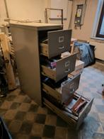 Zware metalen, lichtgrijze archiefkast met vier lades, de onderste lade met een hangmappen. Gebruikssporen zichtbaar. Hoogte: 134