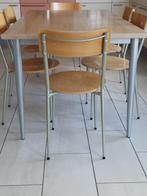 De heel degelijke tafel ( 160 x 90 x 76) met laminaatblad (kleur : lichte eik) heeft een metalen onderstel in zilver kleur. De exclusieve, speciale stoelen hebben ook een metalen onderstel in zilverkl