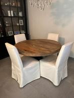 De tafel is in houtkleur( foto 1 ) bovenaan onderstel zwart f tafel in perfecte staat diameter : 1,20 m af te halen in schilde 1 ste verdiep de poot kan eraf en makkelijk via de trap naar beneden