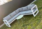Set de salon blanc structure en aluminium et coussins d'assise et de dossier gris (+ 1 coussin d'assise supplémentaire neuf) table d'appoint verte ensemble bien entretenu les coussins sont