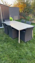 Table en alu et chaise style osier noir. Sur othée (ikea hognoul) toujours rentrée en hiver pieds des fauteuils un peu abime mais ne change rien à l’utilisation et peu se retrouver sur amazon