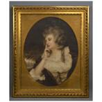 Titel: portret van een jonge vrouw techniek: oude print op papier, onder glas afmetingen: ca. 70 X 54 cm (zonder lijst) inlijsting: elegante vergulde lijst met bladgoud, in empire- of victoriaanse sti
