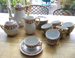 Joli service à café en porcelaine de baudour, début années 30. Blanc avec motif floral et dorure. Une cafetière, un pot à lait, un