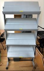 Un présentoir sur roulettes présentoire gris 4 tablettes (inclinaison réglable) dimensions : hauteur 170, largeur 80 et profondeur 40 état impeccable toujours vendu chez bruneau à 150 € on le ven
