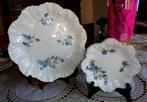 Ancien service à gateaux 1 grande assiette 24 cm diametre 4 petites assiettes 15 cm diametre fond blanc dessins petites fleurs bleus bord festonné avec dorure parfait etat
