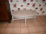 Wit breed ovaal salontafel met een breedte van 1,3 meter. De hoogte is 53 cm. Moet weg vanwege verbouwingen en de prijs is 30 euro. Voor meer info: 0485/965199